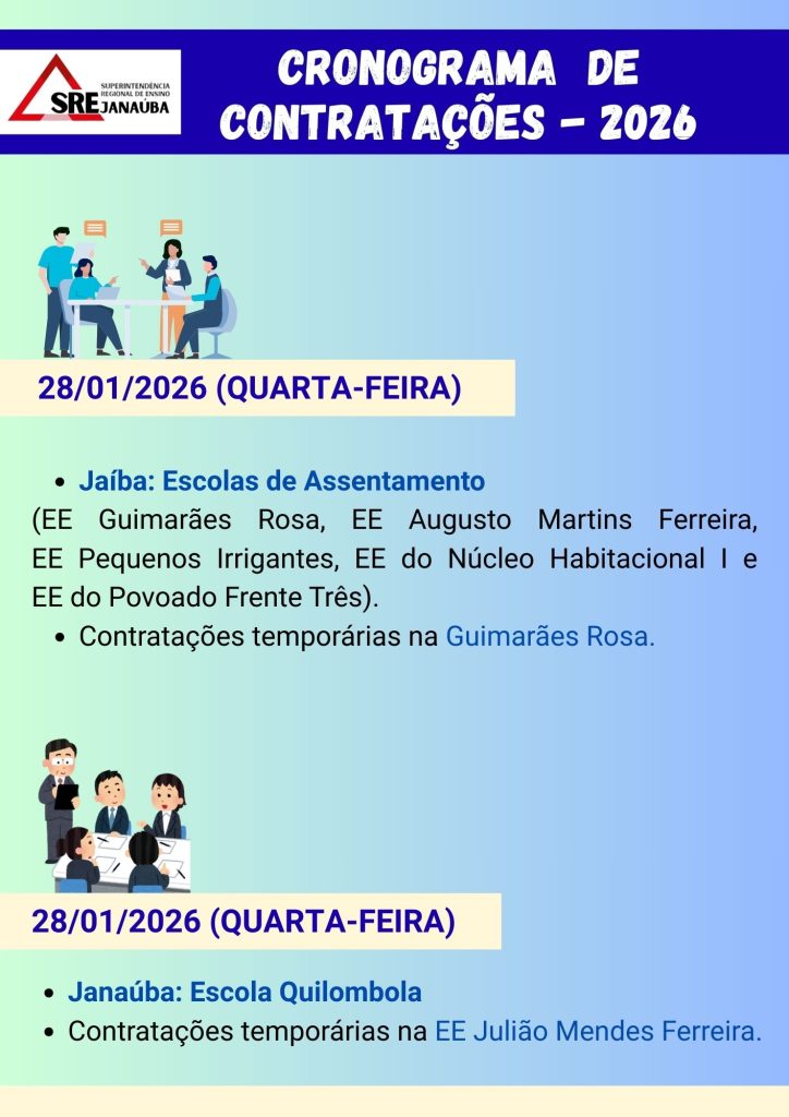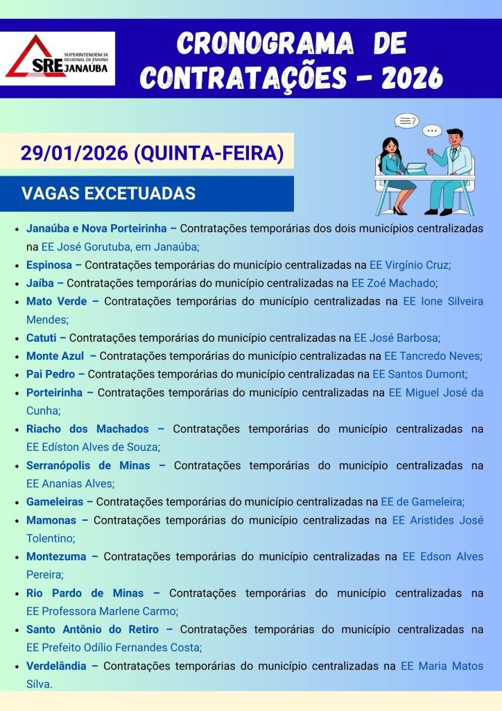 Segue a divulgação do Cronograma de Contratações 2026, em atendimento ao EDITAL PSS SEE/MG Nº 09/2025, do EDITAL PS/SEE/MG Nº 10/2025, da RESOLUÇÃO SEE Nº 5.210/2025 que estabelece normas para a organização do Quadro de Pessoal das Unidades de Ensino na Rede Estadual da Secretaria de Estado de Educação de Minas Gerais (SEE/MG) e da Instrução Normativa SEE/SG ORIENTAÇÃO nº01/2026, acerca das Orientações e cronograma para o início da contratação temporária, das vagas excetuadas e remanescentes do processo online, para a composição do quadro de pessoal das Unidades de Ensino da Rede Estadual de Minas Gerais.