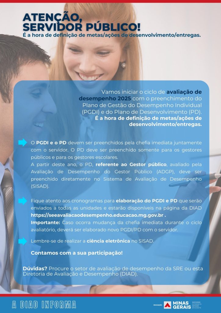 A DIAD INFORMA que é hora de definição de metas/ações de desenvolvimento/entrega. Será iniciado o ciclo de avaliação de desempenho 2025 com o preenchimento do Plano de Gestão do Desempenho Individual (PGDI) e do Plano de desenvolvimento (PD).